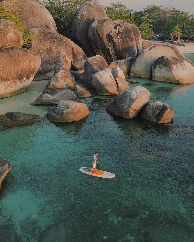 Pulau Belitung terkenal dengan pantai pasir putih, air jernih, dan batu granit besar unik. Pulau ini cocok untuk wisata keluarga dan fotografi.